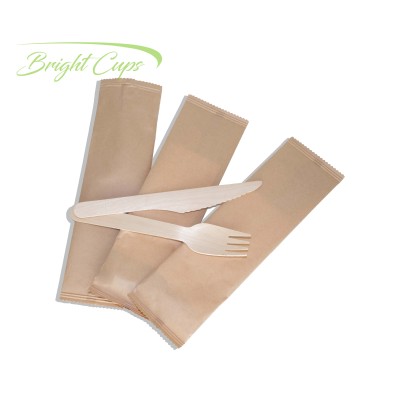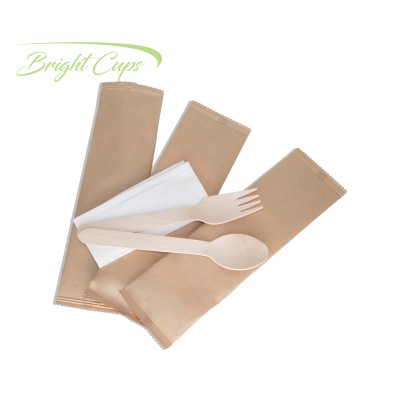 3 in 1 16cm Wooden Cutlery Set - Spoon, Fork, Tissue Printed Wrapped