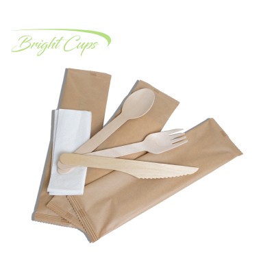 4 in 1 16cm Wooden Cutlery Set - Spoon, Knife, Fork, Tissue